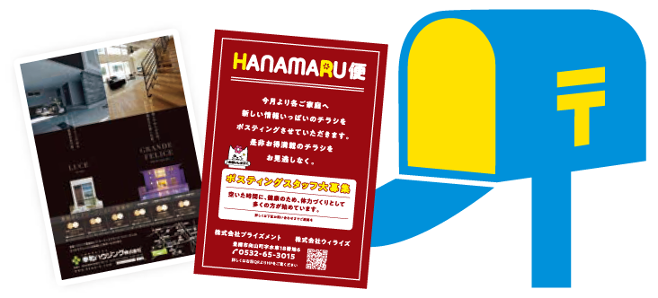 配布効率と地域に密着した情報誌「HANAMARUポスティング」との併配で手に取ってもらう可能性が高まります。 -